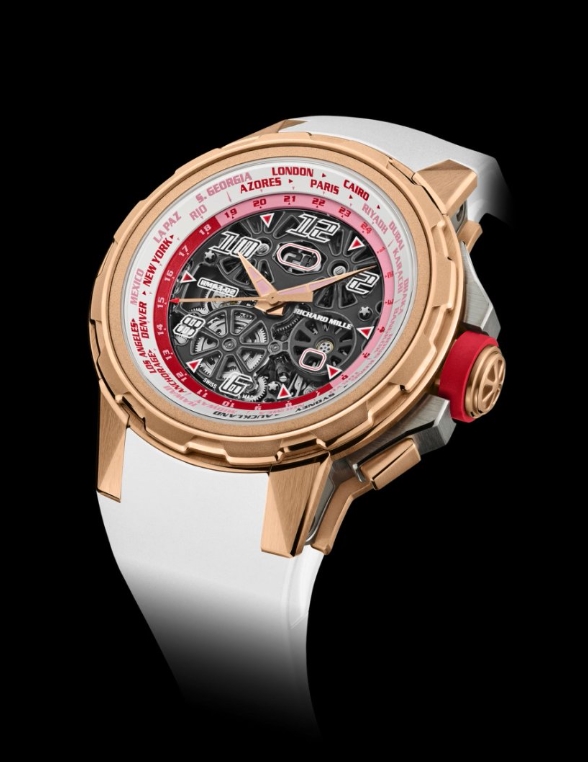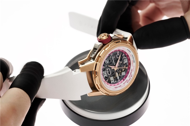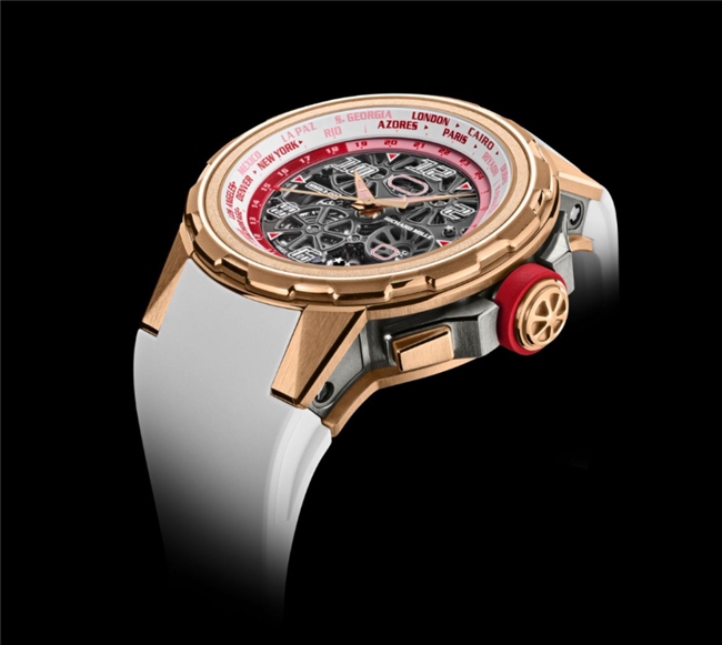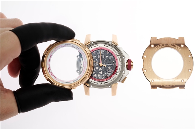 RM63-02搭载直径47毫米、厚度13.45毫米的圆形表壳,由丝光打磨5N红金经铣削成型,辅以抛光斜角处理,中层表壳采用五级钛合金打造,其表面润饰与正面完美呼应。优雅廓形兼顾人性化操作与全天候舒适佩戴体验,底盖经品牌标志性的多重弧度铣削工艺雕饰。三件式表壳内含106枚零件,其中12枚零件专为驱动世界时表圈而生,另有86枚CRMA4机芯零件协同实现此精密时区机制。
